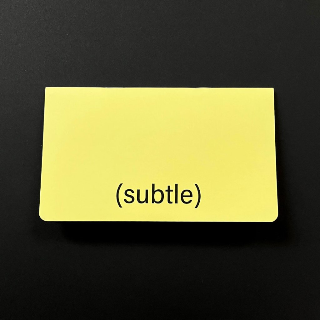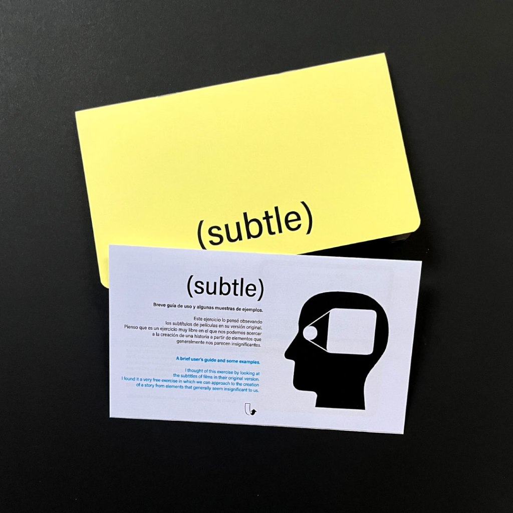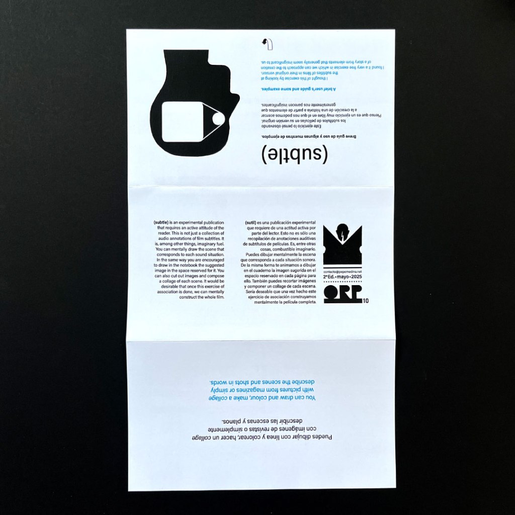 (SUBTLE) es una publicación experimental que requiere de una actitud activa por parte del lector. Esto no es sólo una recopilación de anotaciones auditivas de subtítulos de películas. Es, entre otras cosas, combustible imaginario. Un ejercicio de creación de imágenes e historias con el apoyo evocador de los sonidos.