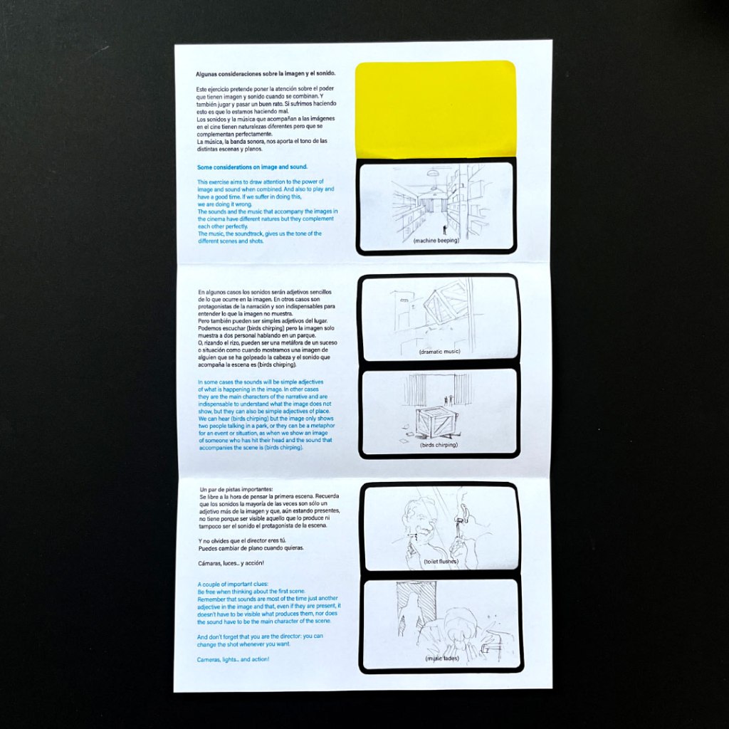 Puedes dibujar mentalmente la escena que corresponda a cada situación sonora. De la misma forma te animamos a dibujar en el cuaderno la imagen sugerida en el espacio reservado en cada página para ello. También puedes recortar imágenes y componer un collage de cada escena. Sería deseable que una vez hecho este ejercicio de asociación construyamos mentalmente la película completa.